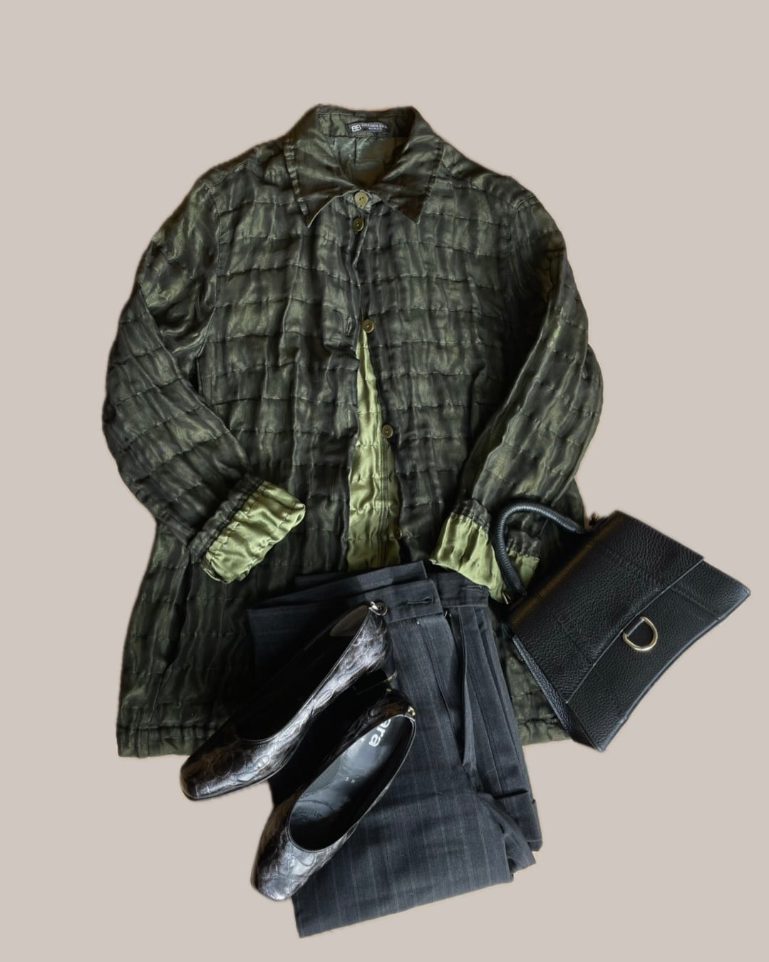 落ち着いたオリーブカラーが印象的なキルティングシャツジャケット。