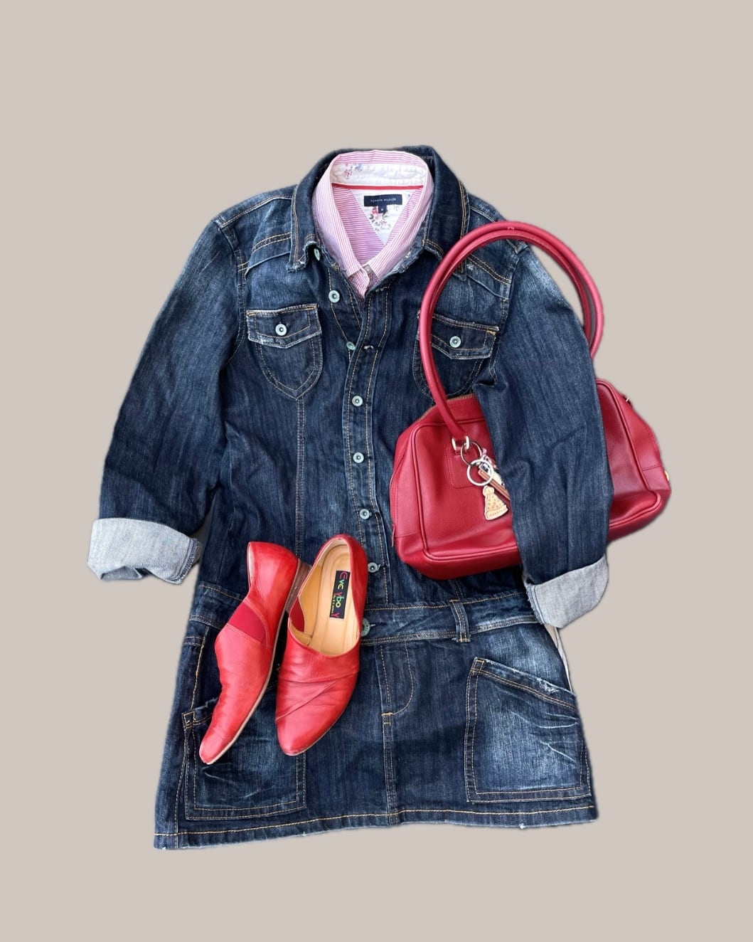 赤と白の細かなストライプが爽やかな印象のTOMMY HILFIGERのデザインシャツ。