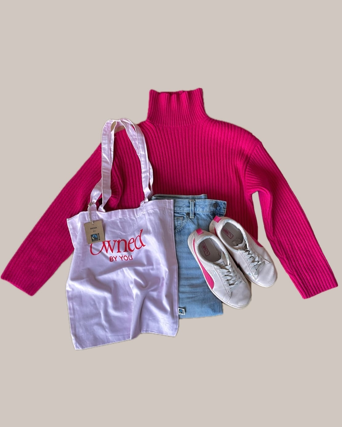発色の良い ビビッドピンク(フューシャピンク系) のカラーが特徴的で、シンプルなコーディネートに取り入れるだけでスタイリングを華やかにしてくれる一着。特にデニムとの相性が良く、カジュアルながらも洗練された印象のコーディネートが完成します。