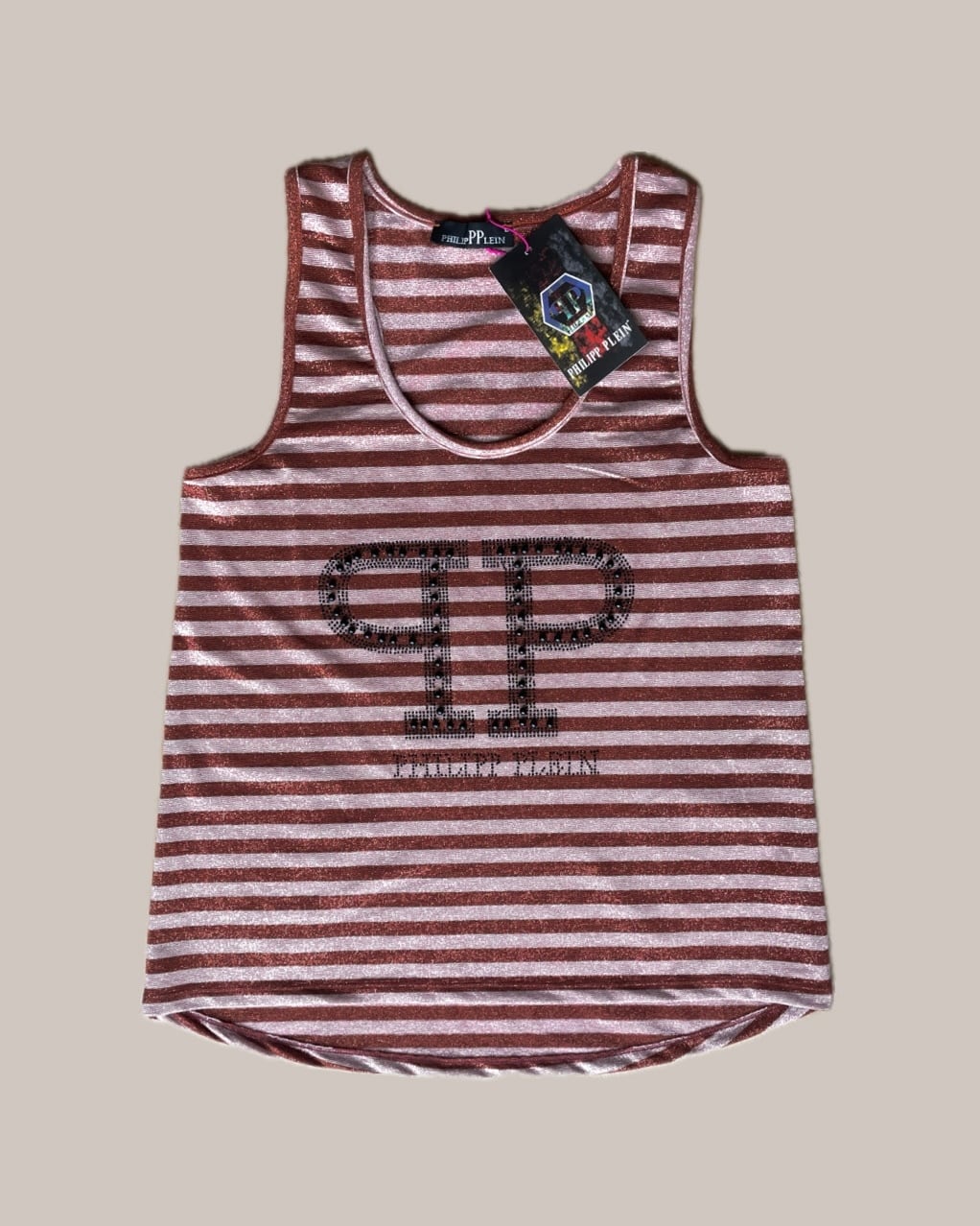 フロントにはブランドの 「PP」ロゴ が大きく配置されており、ビーズやストーンを使った 立体的なロゴ装飾 がポイント。グリッターの質感とビーズディテールが組み合わさることで、シンプルなシルエットながらもデザイン性の高いトップスに仕上がっています。
