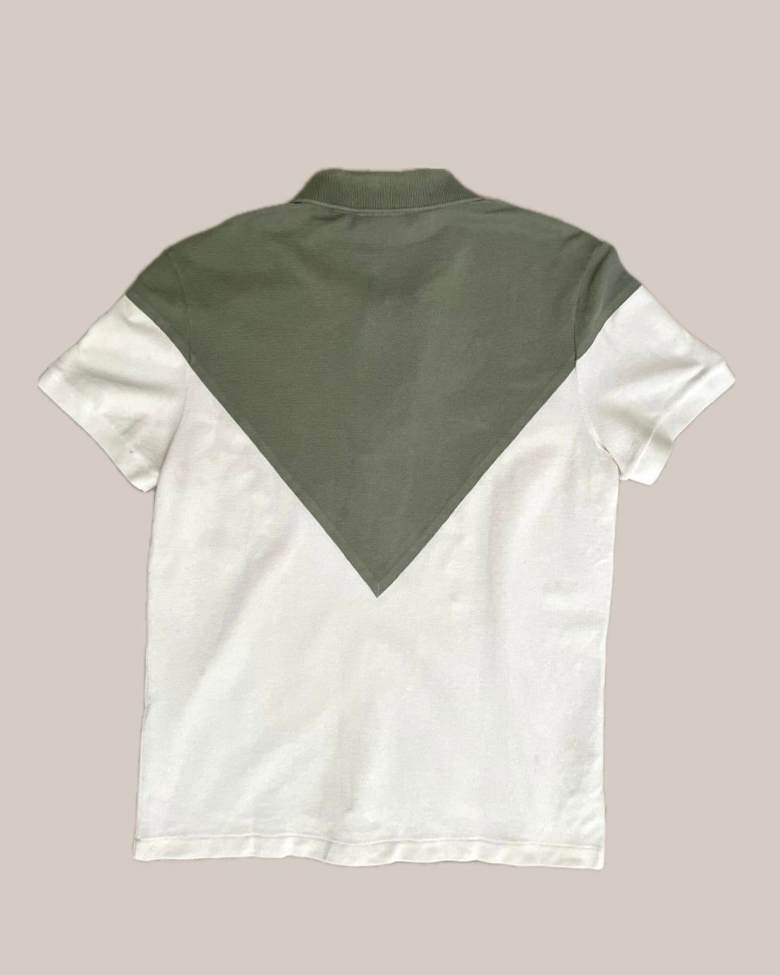 オリーブグリーンとホワイトをベースに、フロントに大胆に入ったクロスラインが印象的で、シンプルなポロシャツにモダンなエッセンスを加えた一着です。スポーティーさの中に、どこかアート性も感じられるデザインが魅力。