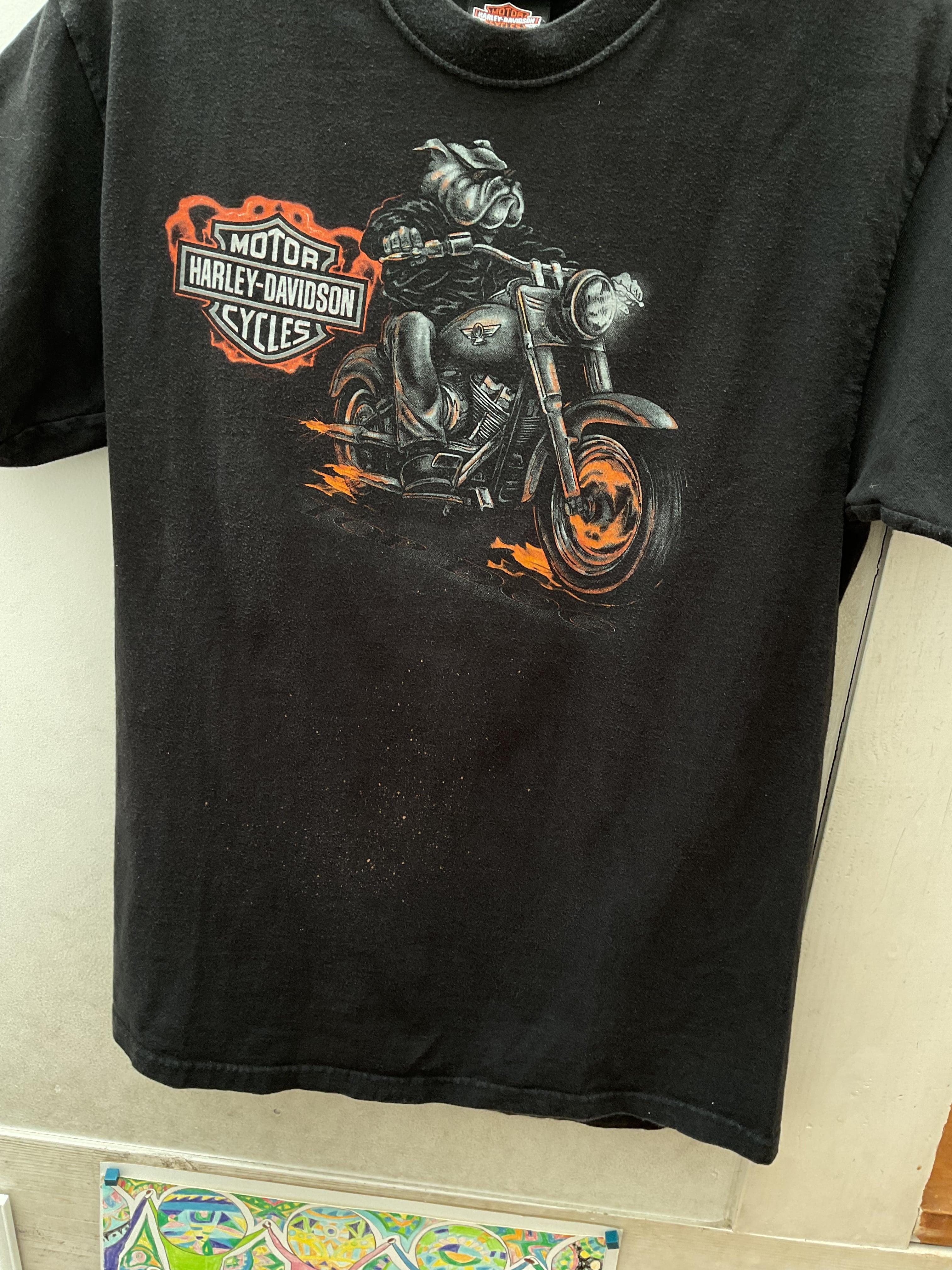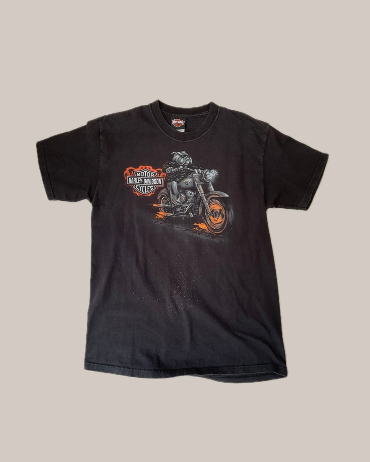フロントにはバイクに乗るライダーのグラフィックが描かれ、オレンジの炎のアクセントが効いたハーレーらしい力強いデザイン。