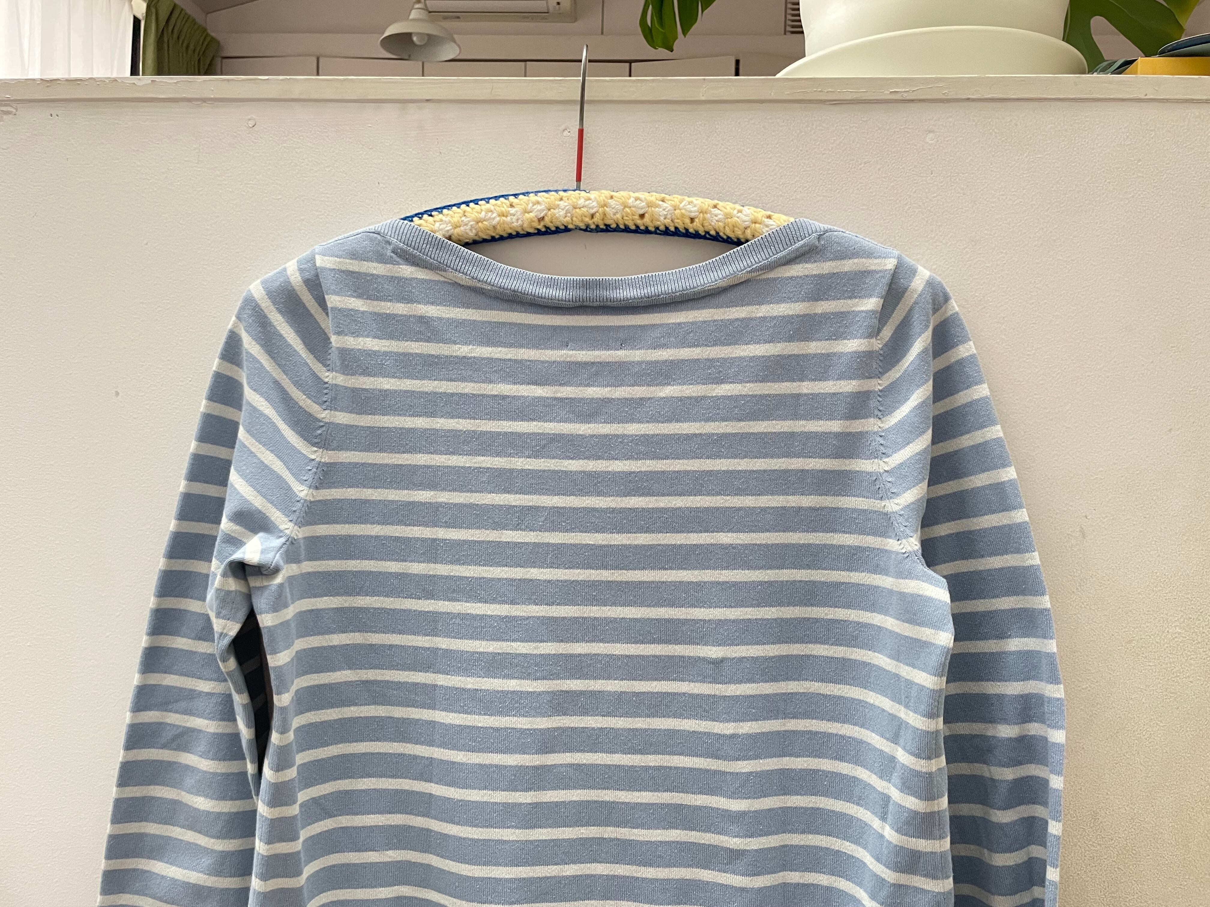 柔らかいカラーリングと細ボーダーのバランスが絶妙で、デニムやスラックスなど様々なボトムと相性◎。