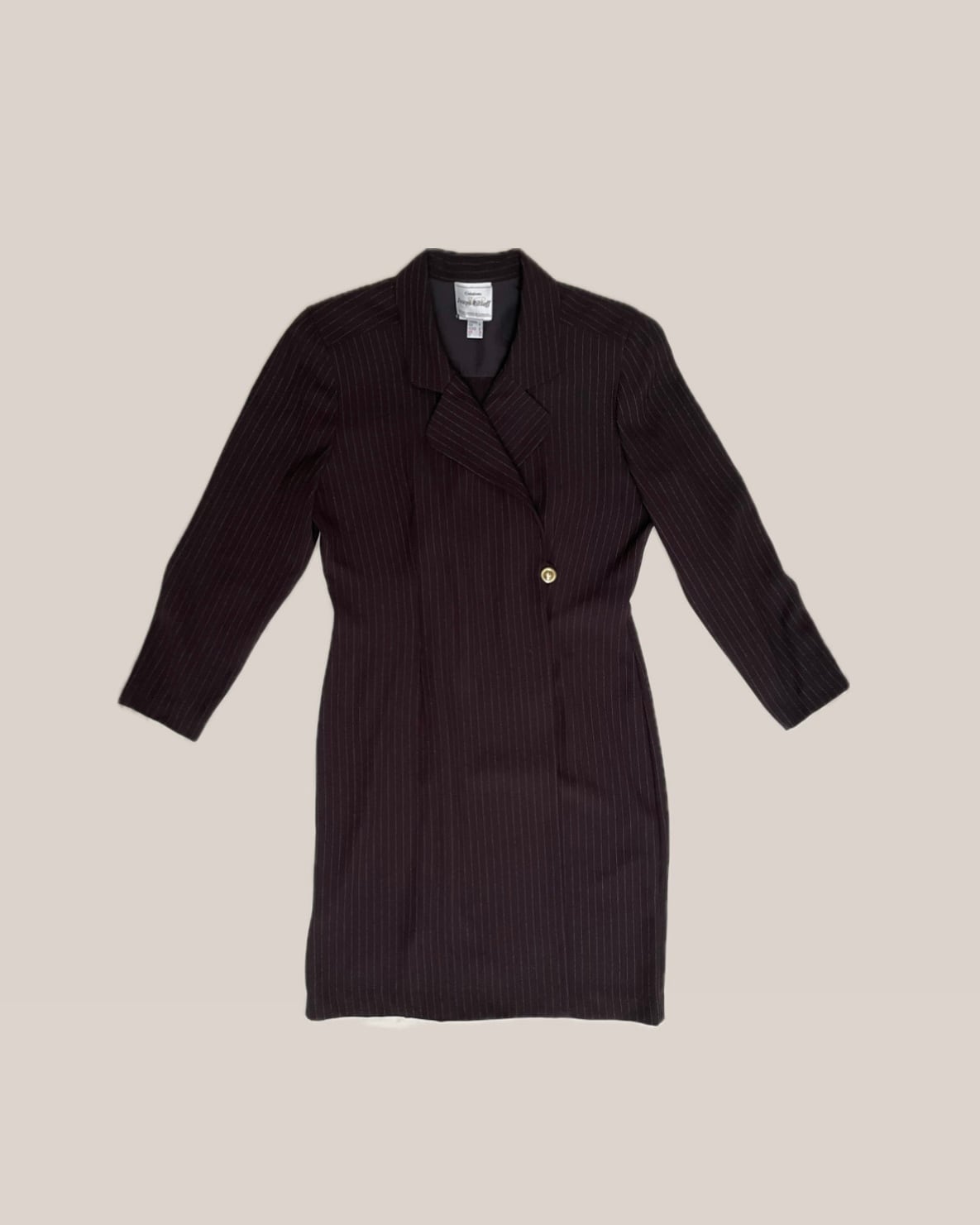 落ち着いたブラウンベースに、クラシックなピンストライプが映えるレトロなワンピース。