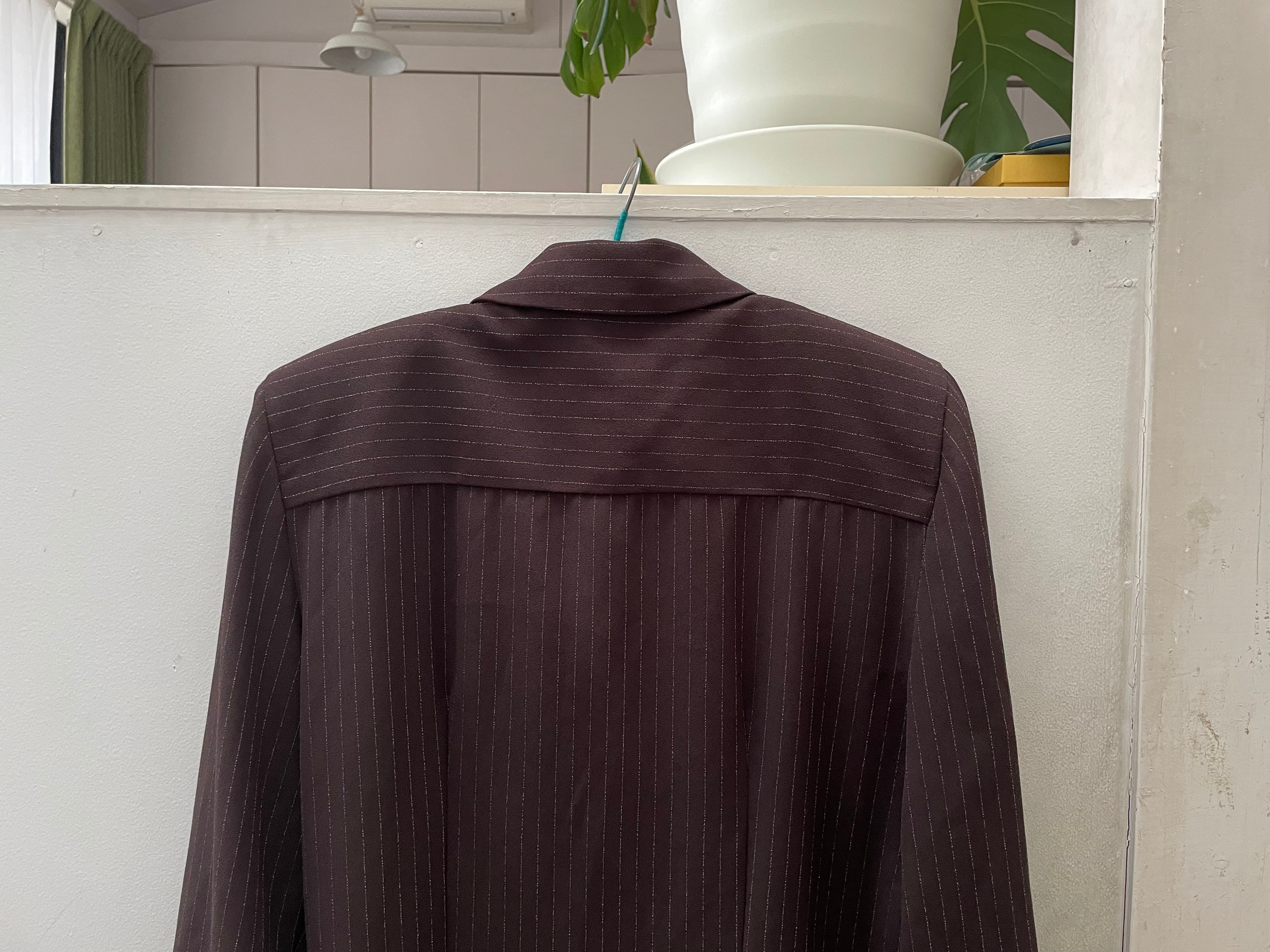 ピンストライプと深みのあるブラウンカラーの組み合わせが、どこかヴィンテージライクで落ち着いた雰囲気を演出。ブーツやヒールと合わせてクラシックにまとめるのはもちろん、スニーカーで外しても楽しめる一着です。