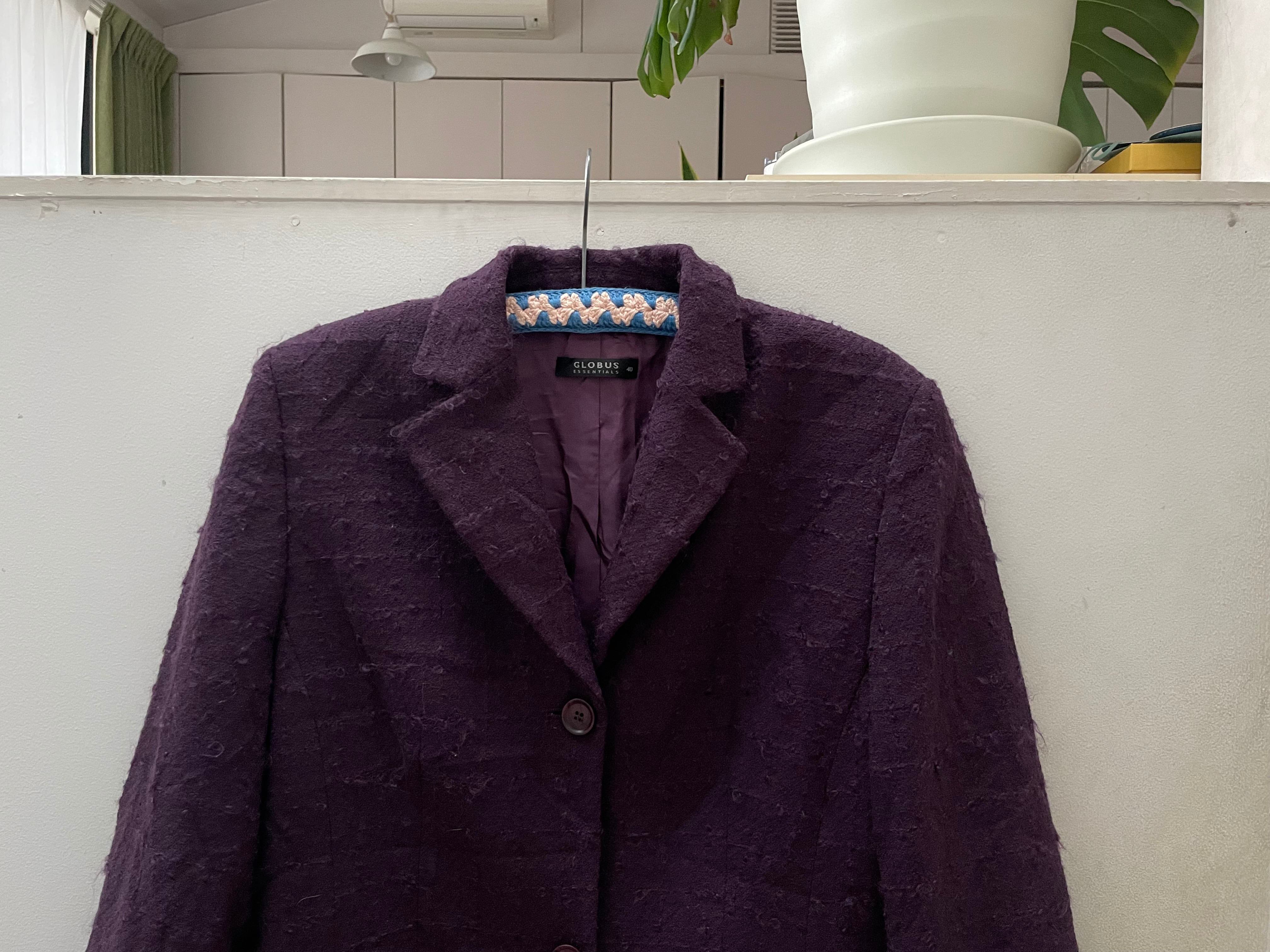 落ち着いたパープルカラーに、凹凸のある生地感が特徴的なジャケット。